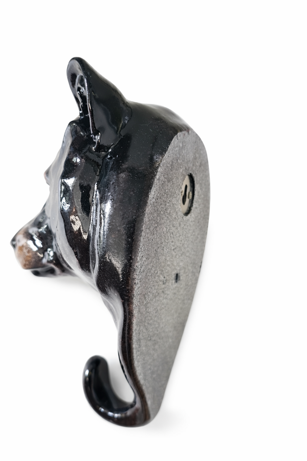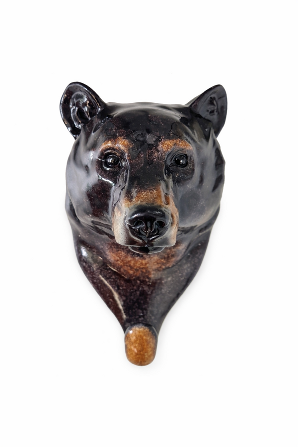 Decorative cermaic wall hook featuring a glossy black bear head with realistic detailing and subtle brown accents. Includes a curved hook for hanging coats, bags or accessories with textured backplate for easy wall mounting.