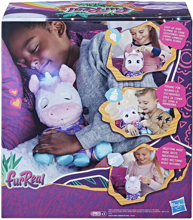 Reach for the furReal Sweet Jammiecorn Unicorn light-up toy day and night. She's soft, snuggly, and kids ages 4 and up can show this plush pet just how much they care. In day mode, feed her with the included bottle, and she’ll make cute eating noises and playful sounds. What makes this interactive toy even more adorable? Kids can cuddle up with her at bedtime, too. When it's time for lights out, press her horn to close her eyes. The horn will also change color from a happy yellow for day to a soothing blue for night. If kids want to hear lullabies or calming white noise soundscapes, just press the pet’s ear in night mode. This day-to-night friend makes a wonderful gift and a cherished friend. furReal and all related properties are trademarks of Hasbro.