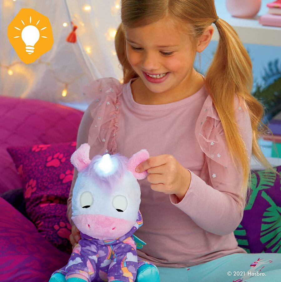 •ADORABLE UNICORN TOY FOR DAY AND NIGHT: The furReal Sweet Jammiecorn Unicorn toy is a soft and squishy pet that's perfect for kids to hug and hold