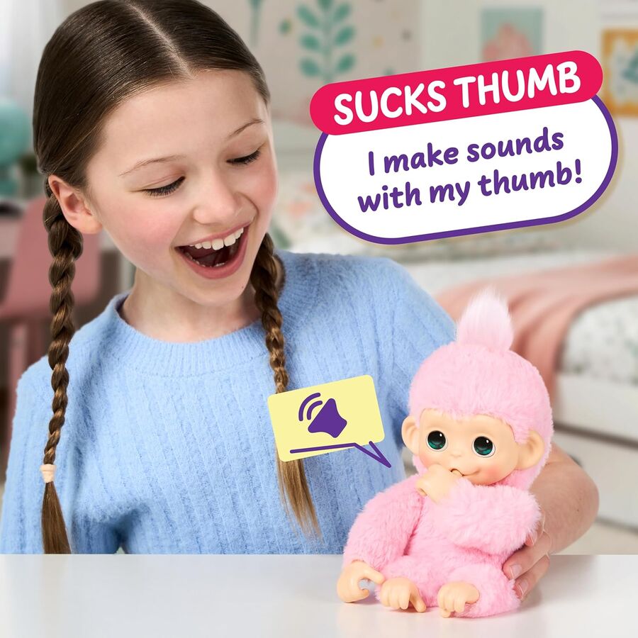 - Realistic reactions: My Baby Monkey Minis can grip, grab, hang, and hug onto objects. They can even suck their own thumbs!