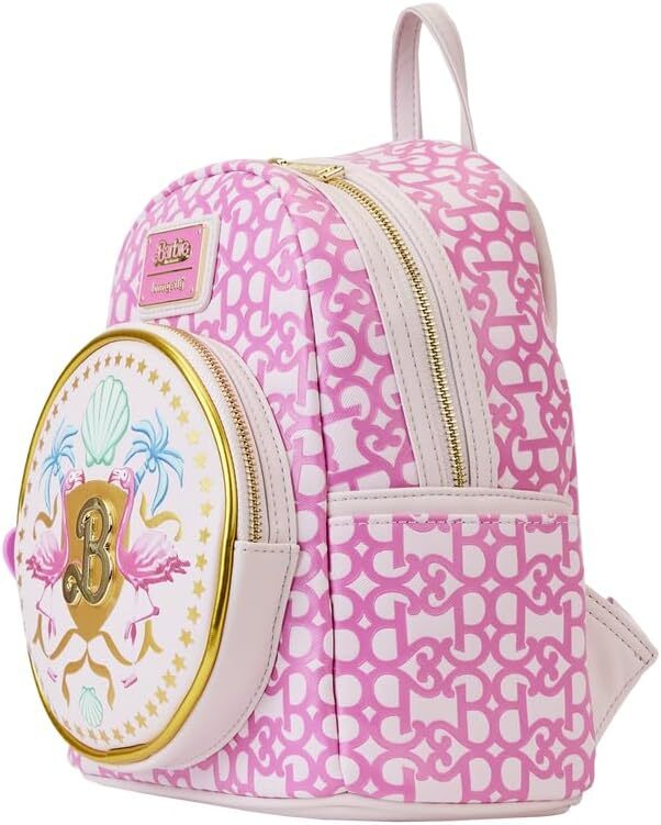 Think pink and head to Barbie Land™ in style. Our Loungefly Mattel Barbie™: The Movie Logo Mini Backpack is full of fun, summery beach vibes and on-trend colors. An allover print of the Barbie logo—in pink—adds a signature touch. On the front, a circular-shaped pocket features a shiny gold emblem of Barbie’s logo, against a golden shield. Twin flamingos appear on either side of the shield, along with pastel-colored shells and palm trees. Gold stars frame the scene as well. A pink silicone heart-shaped zipper charm, which also features Barbie’s logo in the center, completes the look. This backpack is roomy enough for securing your daily essentials, whether you’re rollerblading in the sun or seeking that picture-perfect spot on the beach.