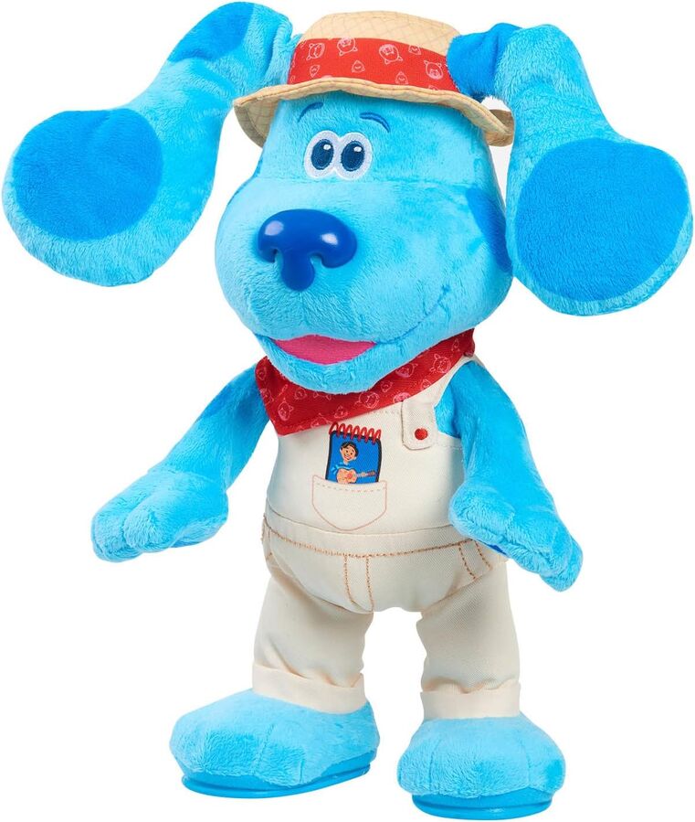 Sing, dance, and learn with Farmer Blue! This 36 cm interactive plush from Nickelodeon's Blue's Clues & You! wears a cute farmer outfit and is ready for playful adventures. Squeeze her paw to start Song mode, where Blue dances, moves her ears, and sings the "Bingo" song with Josh.