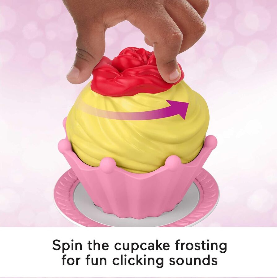 - Full-size pretend cupcake with frosting that spins and clicks Figure and play pieces sized just right for small hands to grasp and move, helping to strengthen fine motor skills