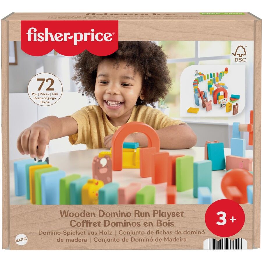 Preschool kids are in for hours of building and knock-down fun with the Wooden Domino Run Playset from Fisher-Price. Made with wood from Forest Stewardship Countil-certified sources (FSC C004225), this 72-piece set lets kids design and build their own farm-themed domino runs featuring cute farm animal friends and even a windmill. Kids will love designing a pattern, setting up the pieces and rolling the ball to get the exciting tumbling action going, again and again! Colours and decorations may vary.