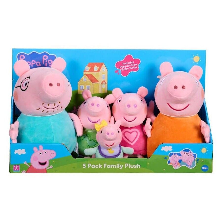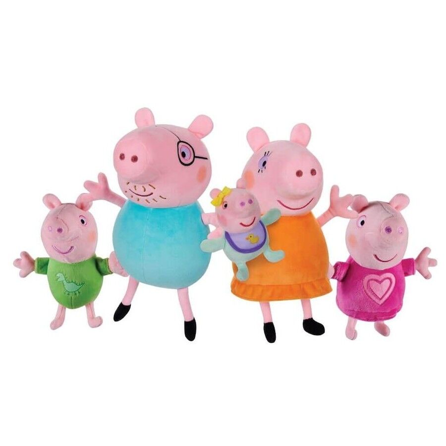This family set features the full Peppa Pig family, including Peppa and George's new baby sister Evie! The plush is perfect size to cuddle up with or take with you anywhere. Ideal for storytelling and roleplaying, this plush Peppa Pig Family set includes Mummy and Daddy Pig. There's also Peppa and George to join the fun, as well as their brand-new baby sister Evie! This Peppa Pig Family set is made from supersoft plush with classic Peppa Pig styling. Mummy & Daddy measure 20cm, Peppa 17cm, George 15cm, Baby Evie is 9cm tall.