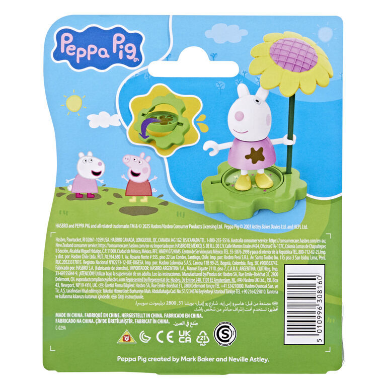 Rain or shine, it's Peppa playtime with the Muddy Puddle Suzy figure! Adorable 3-inch (7.5 cm) poseable figure is wearing yellow rainboots and can hold the included stick that becomes an umbrella for rainy days and a big sunflower for sunny days! The base piece can be flipped to show grass or a muddy puddle, paving the way for everyday adventures. Look for more Muddy Puddle Friends figures (each sold separately, subject to availability) and connect the bases for even more pretend play! Preschool toys like these make great party favors for a Peppa Pig birthday or small gifts for 3 year old girls and boys and up.