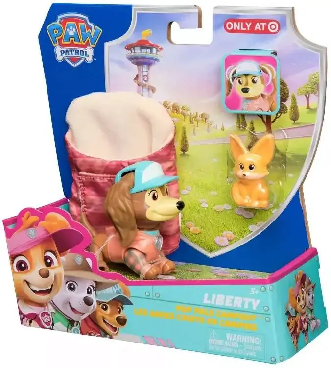Introducing the PAW Patrol Pup Pal's Campout Figure set! At 9cm tall, these pups bring a new level of excitement to action figures with their bobble head and articulated limbs, allowing for dynamic pretend play. This set includes a cosy sleeping bag, with a special pouch for her animal friend to snuggle into, making it PAWfect for storytelling and role play. Skye is ready to embark on thrilling adventures! These PAW Patrol learning toys are PAWsome for a birthday, Christmas or any holiday. For even more fun, look for Skye and Liberty Campout Figures and combine with the Pupcation Rescue Set, so the excitement never ends. (each sold separately) Relive cherished moments from past PAW Patrol seasons, like the Mighty Pups and PAW Patrol Movie or create new adventures with a PAW Patrol tower, individual PAW Patrol action figures and their PAW Patrol vehicles, for turbo-charged adventures.