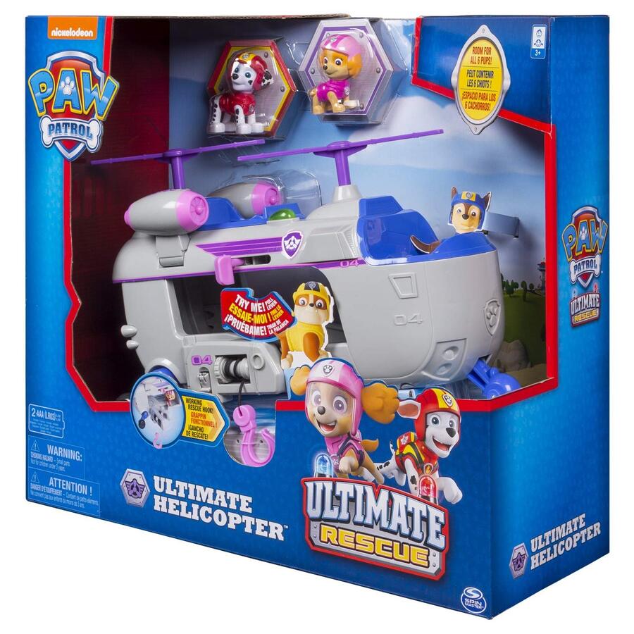 This pups gotta fly! Take to the sky with the Ultimate Rescue Helicopter! This helicopter is equipped with a moving propeller, flip-down handle and extendable rescue hook! With room for all 6 pups (2 figures included) on board, the PAW Patrol is ready for a ruff, ruff, rescue! Open the back door to load in the pups, then place Skye and Marshall in the cockpit and lift off. Pull on the pink lever and you'll activate the rotating propeller, flashing lights and realistic helicopter sounds! When you and Skye spot a baby animal (not included) in trouble, pull out the extendable rescue hook. Place it around the baby animal and pull them to safety! For even more excitement, store an Ultimate Rescue Mini Vehicle (not included) aboard for last-minute rescues! With flashing lights, realistic sound effects and an extendable rescue hook, this helicopter brings all the excitement of Adventure Bay into your home! Join Skye on an action-packed adventure with the Ultimate Rescue Helicopter!