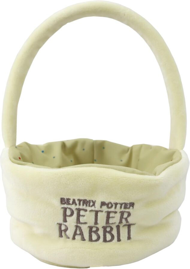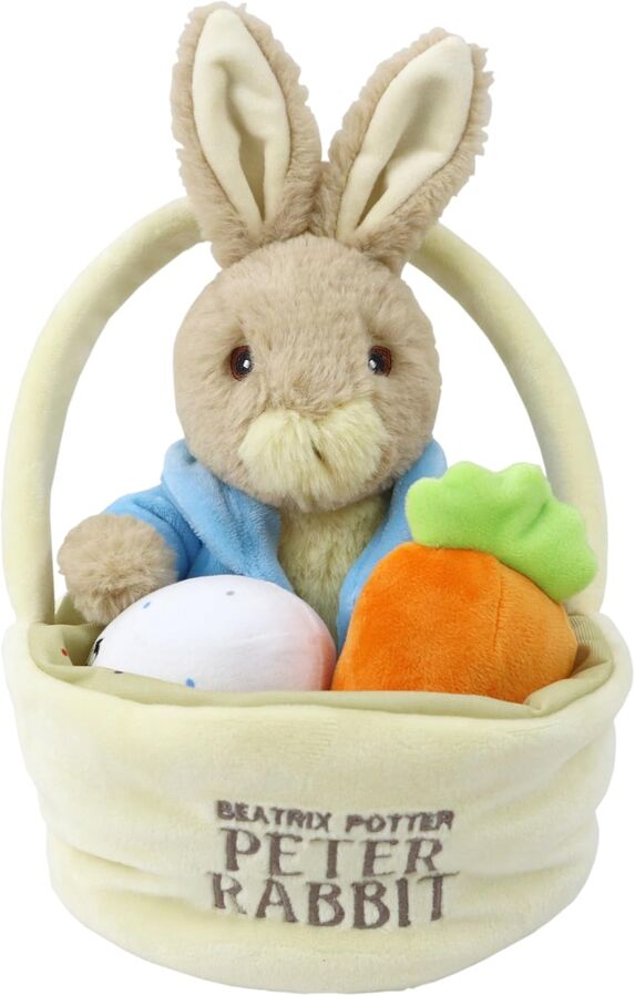 This Peter Rabbit four-piece playset features a Peter Rabbit plush, a satisfying crinkle carrot toy, plush egg rattle all held inside a soft, pastel yellow Easter basket with adorable embroidery,