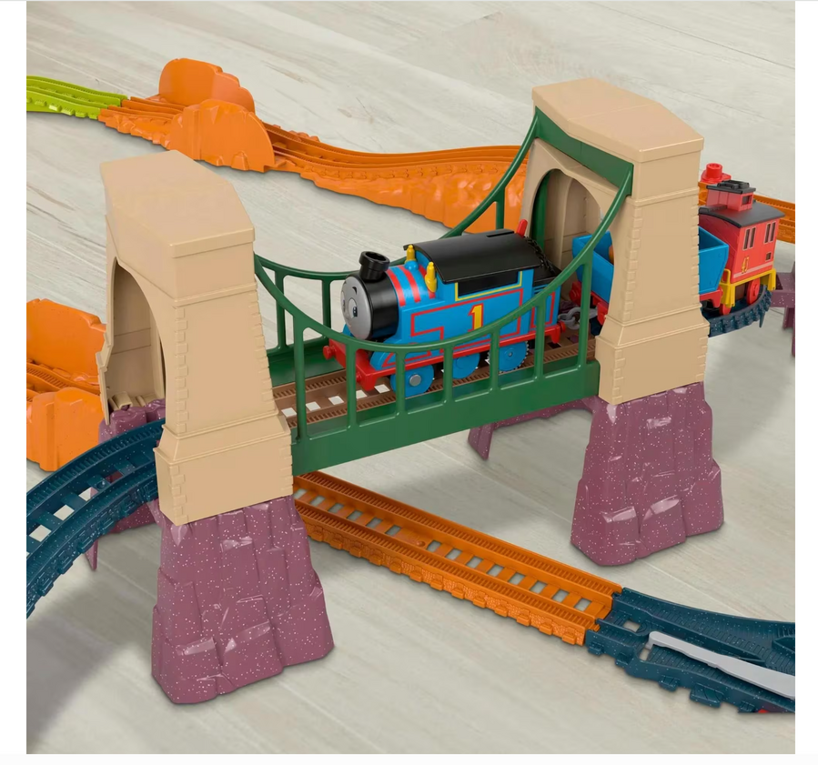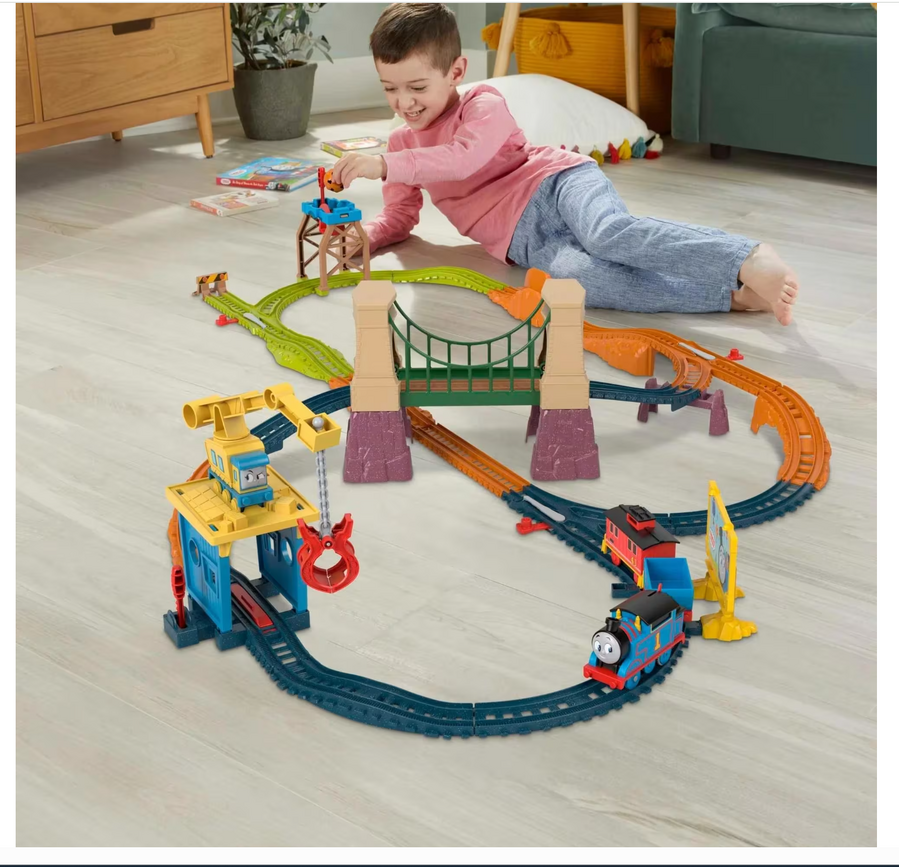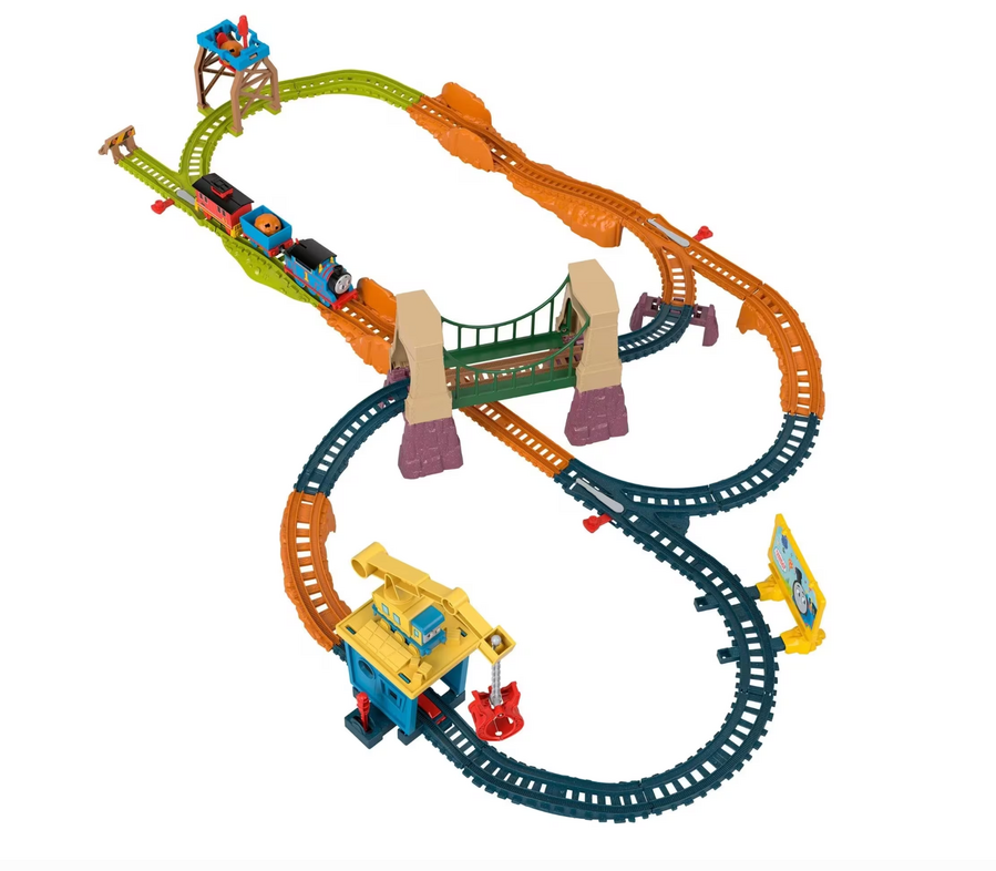 - Flip the switch on top of the Thomas motorized engine to send him racing along tracks and over (or under) the bridge; Interactive play points let kids load and unload cargo using the crane