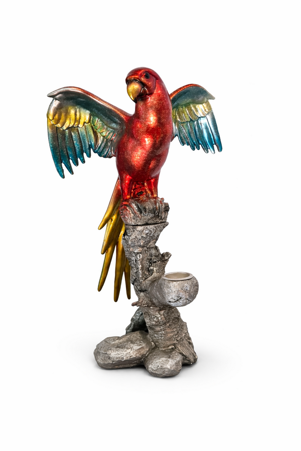 Decorative parrot figurine freaturing a vibrant red macaw perched on a textured silver tree stump base.