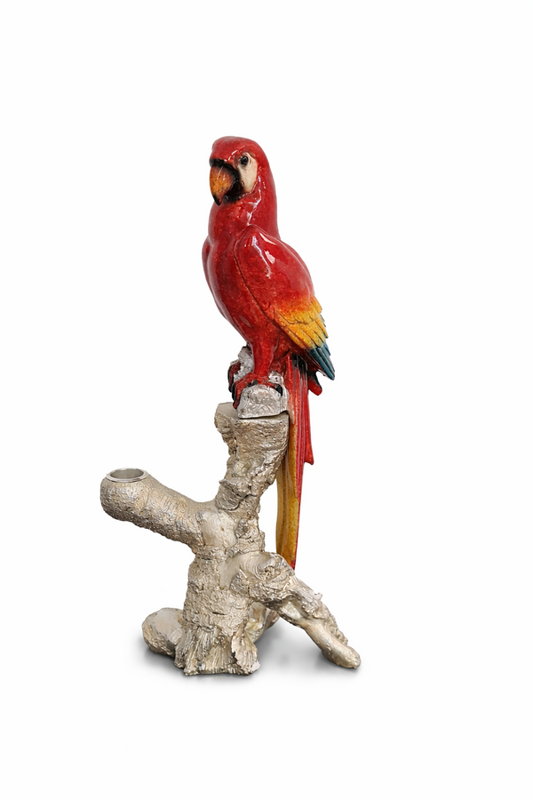 Decorative parrot figurine freaturing a vibrant red macaw perched on a textured silver tree stump base.