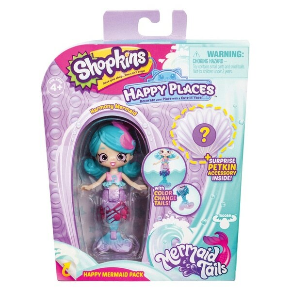Dive in and open up an ocean of possibilities! Take a journey under the sea with the Lil' Shoppies to a new magical Happy Place. The Lil' Shoppies have become beautiful mermaids! Open the window of the Happy Mermaid Pack to find a surprise Petkin accessory. Each mermaid is beautifully themed and has a magical color change tail! Includes: 1 x Lil' Shoppie Mermaid 1 x Petkin accessory 1 x Collector's guide