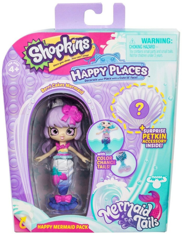 Dive in and open up an ocean of possibilities! Take a journey under the sea with the Lil' Shoppies to a new magical Happy Place. The Lil' Shoppies have become beautiful mermaids! Open the window of the Happy Mermaid Pack to find a surprise Petkin accessory. Each mermaid is beautifully themed and has a magical color change tail! Includes: 1 x Lil' Shoppie Mermaid 1 x Petkin accessory 1 x Collector's guide