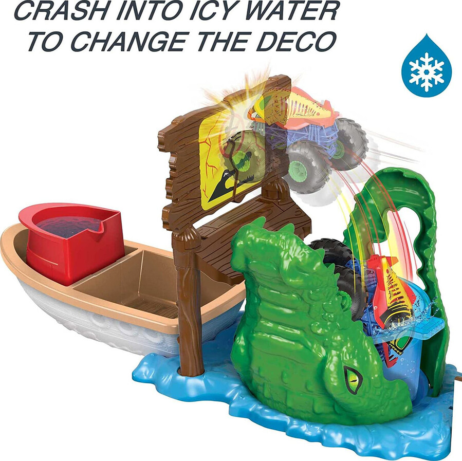 - Smash to safety in the Hot Wheels Monster Trucks Swamp Chomp playset and watch Color Shifters vehicles emerge with different colors and designs