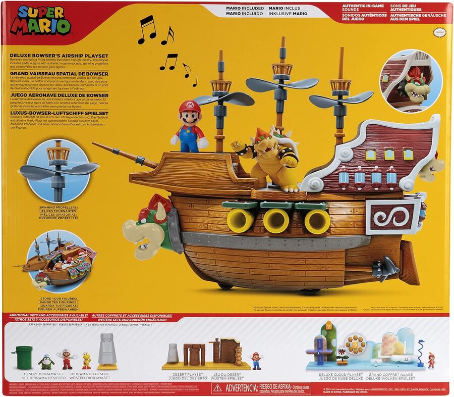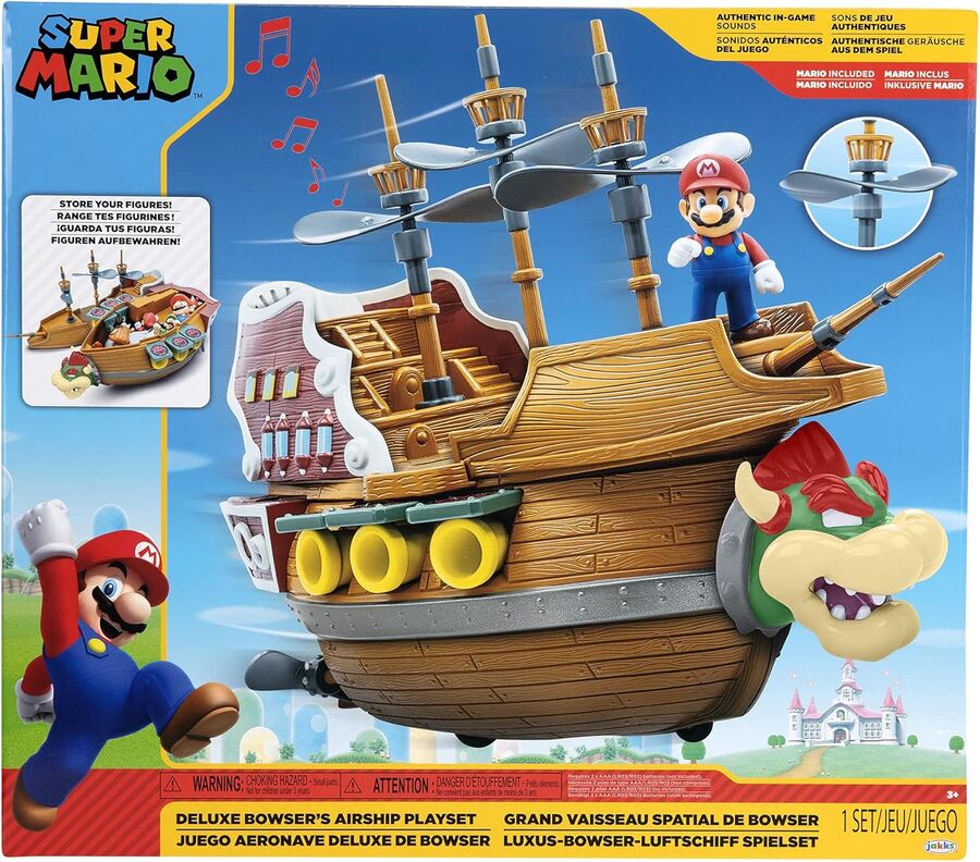 The Deluxe Bowser's Airship is a propeller driven fortress created to bring your Super Mario™ playset dreams to life. Equipped with cannons, rotating propeller masts, wheels, and authentic in-game sounds, the Airship includes a two and a half inch Mario figure poised for victory. Roll the airship to activate spinning propellers and open the ship to store all your figures! Press the button to activate Bowser’s menacing laugh and other in-game sound effects. Mario must conquer the Airship to stop the invasion of the Mushroom Kingdom. It's up to you, Mario and his friends to defeat Bowser. This playset works with most two and a half inch figures.