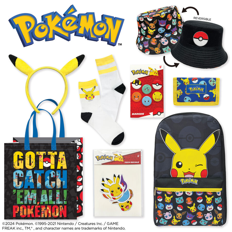 Show off your love for Pokémon with tech decals and badges, and keep your pocket money safe in the Pokémon wallet. Plus, trade and battle with friends using the Pokémon GO trading cards—a must-have for any fan! Everything fits neatly into the Pokémon reusable tote bag, making it easy to take your Pokémon adventure anywhere.