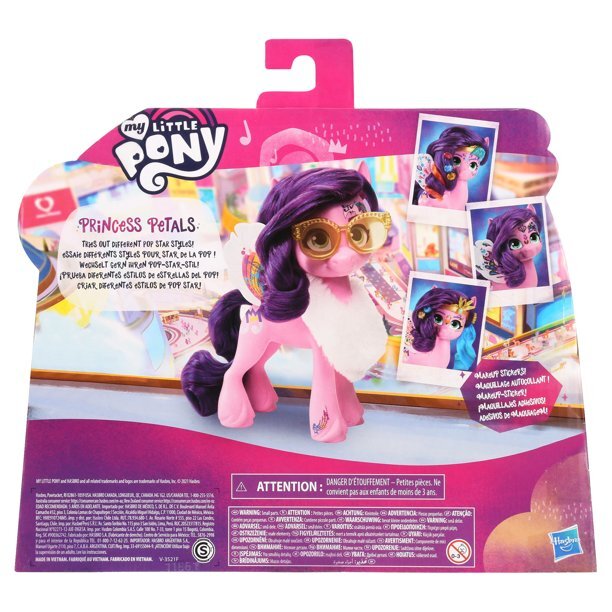 Get to know Princess Petals: a Pegasus from Zephyr Heights! Princess Petals is a stylish and talented pop star. Imagine designing show-stopping looks with Performance Prep Princess Petals, inspired by the My Little Pony: A New Generation movie. Includes a 6-inch Princess Petals pony figure with a character-inspired music note Cutie Mark on one side. Figure has a long, soft purple mane for hair play fun! The 4 included sticker sheets can be used to give her customizable makeup looks. Put the stickers on her face, wings, and body to mix and match pop star styles. Comes with 17 hair and fashion accessories to imagine she's trying on different costumes before her big show! Fans new and old can imagine adventures with My Little Pony: A New Generation movie toys and gifts for kids ages 5 years old and up. Also look for Zipp Storm Sparkle Adventures (Sold separately. Subject to availability.) My Little Pony and all related characters are trademarks of Hasbro. Includes figure and 17 accessories. Figure scale: 6 inches Ages 3 and upWARNING: CHOKING HAZARD – Small parts. Not for children under 3 years.